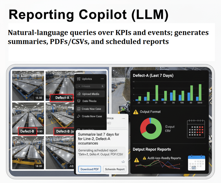 Vision Copilot (VLM) enables multimodal, case-based analysis for images/videos. Upload screenshots or frames, create cases (e.g., “Line-2, Defect-A, Shift-B”), ask questions like “What defect class is this?” and get annotated explanations, timelines, and cross-case comparisons. Supports evidence snapshots, tags, and exports