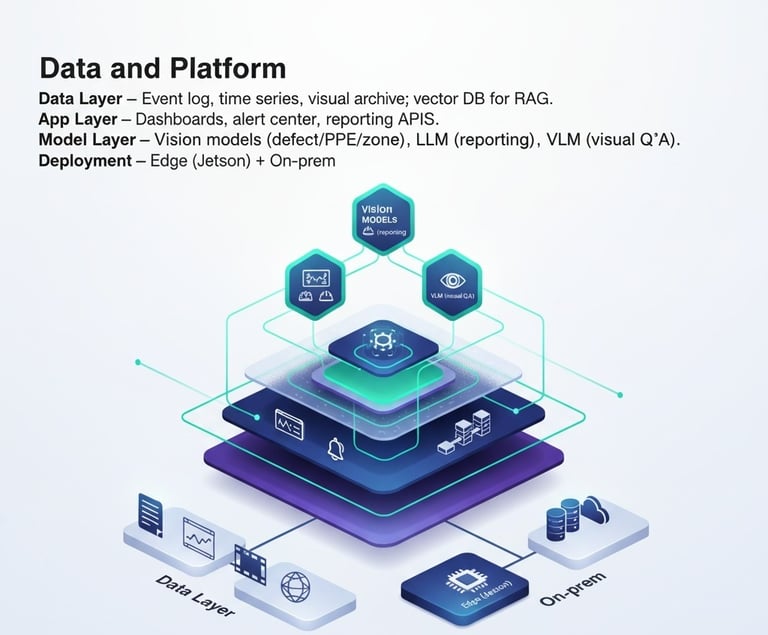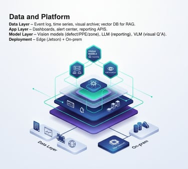 Model Layer: Vision models (defect/PPE/zone), LLM for reporting, and VLM for visual Q&A work together; a model registry manages versions, calibration, and A/B tests.